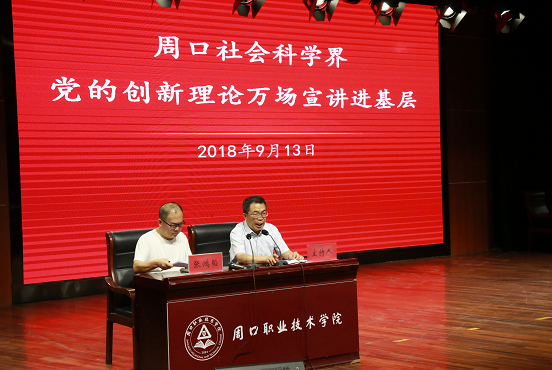 2018年9月13日下午,周口社科界党的创新理论万场宣讲进基层活动在我校开元校区学术报告厅举行。周口师范学院马克思主义学院党总支副书记、副教授张鸿韬以《坚定文化自信》为题作宣讲报告。