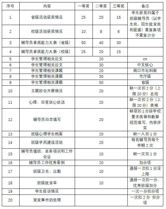 辅导员考核分日常考核和年度考核。日常考核主要考察辅导员对班级的日常管理,比如班级宿舍卫生、宿舍用电安全、学生日常出勤以及宿舍教学区吸烟等方面;年度考核主要包括日常管理、班会、值班、例会、谈心谈话、辅导员日志、档案、就业以及学管相关课题论文等方面。