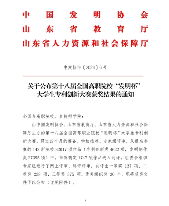 近日,由中国发明协会、山东省教育厅、山东省人力资源和社会保障厅主办的第十八届全国高等职业院校“发明杯”大学生专利创新大赛获奖结果公布。